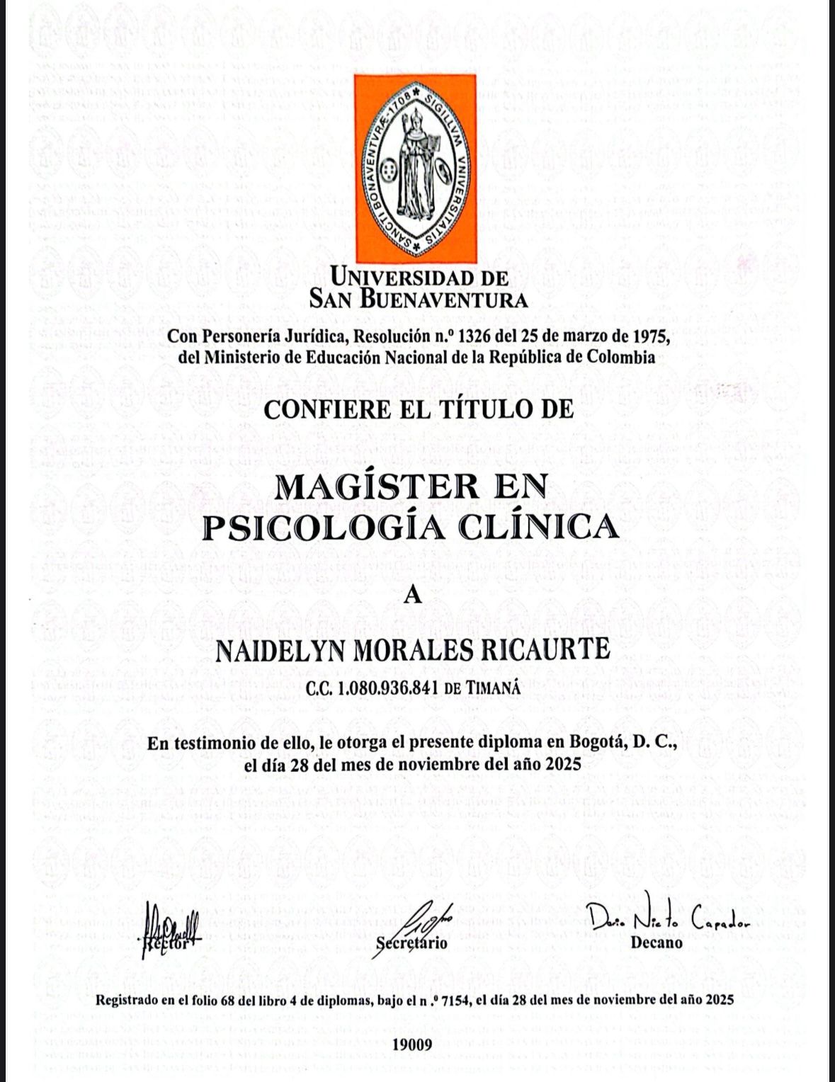 Muy profesional y humana. Desde la primera cita me transmitió confianza, escucha atenta y comprensión genuina. Su manera de orientar, brindar herramientas prácticas y generar un espacio seguro ha sido de gran ayuda en mi proceso personal. Es una profesional empática y sobre todo paciente. La recomiendo con total seguridad a quienes estén buscando apoyo psicológico de calidad, con calidez humana y profesionalismo. Muchas gracias naidelyn